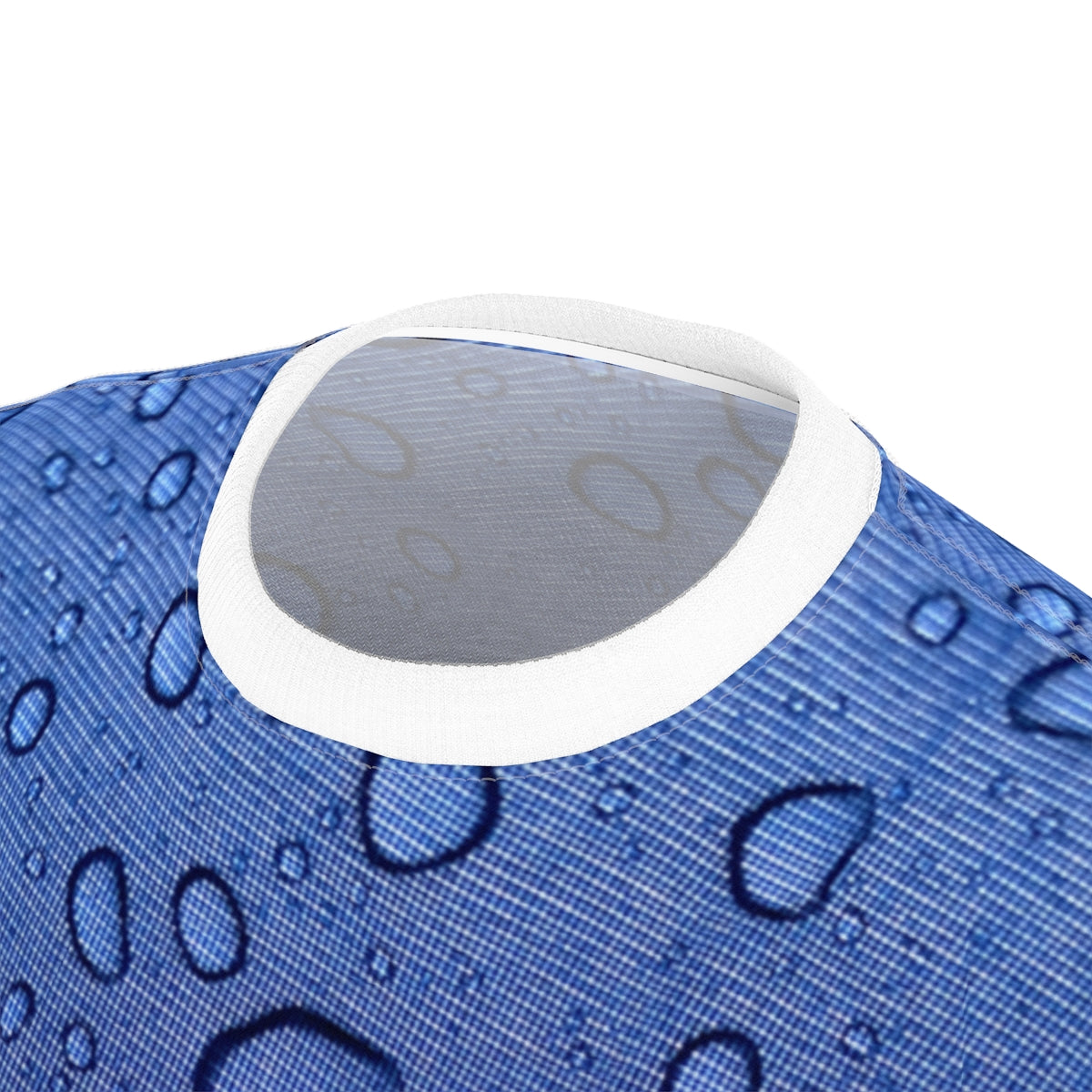 Bright blue t-shirt featuring the underside of raindrops. One upside to years of social isolation is perhaps a deeper appreciation of the beauty of the mundane. Love one another. Be well. Spring 2022.