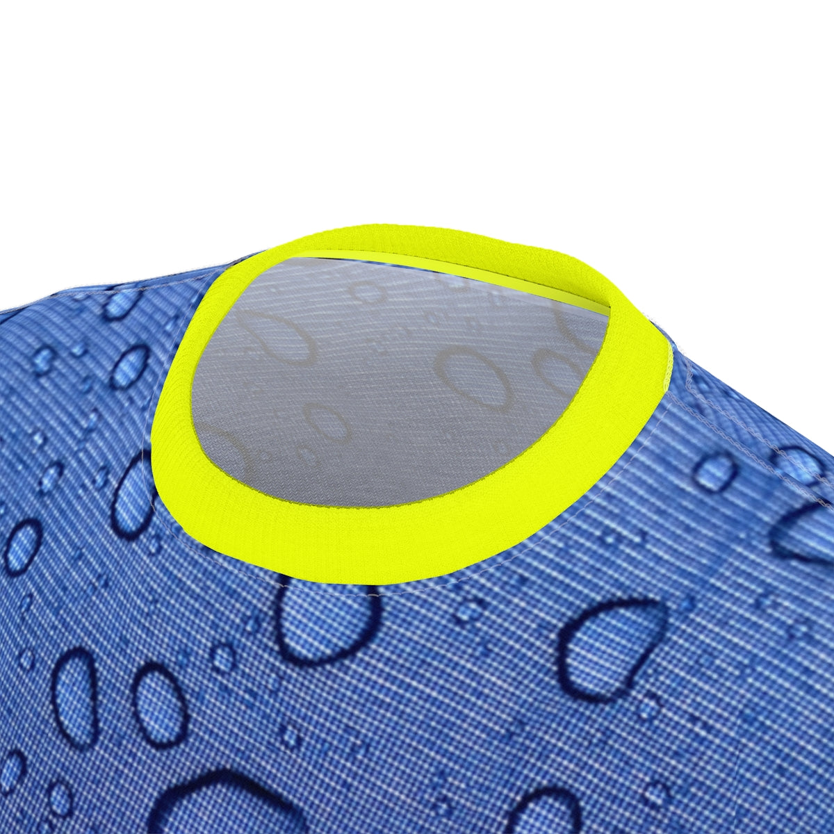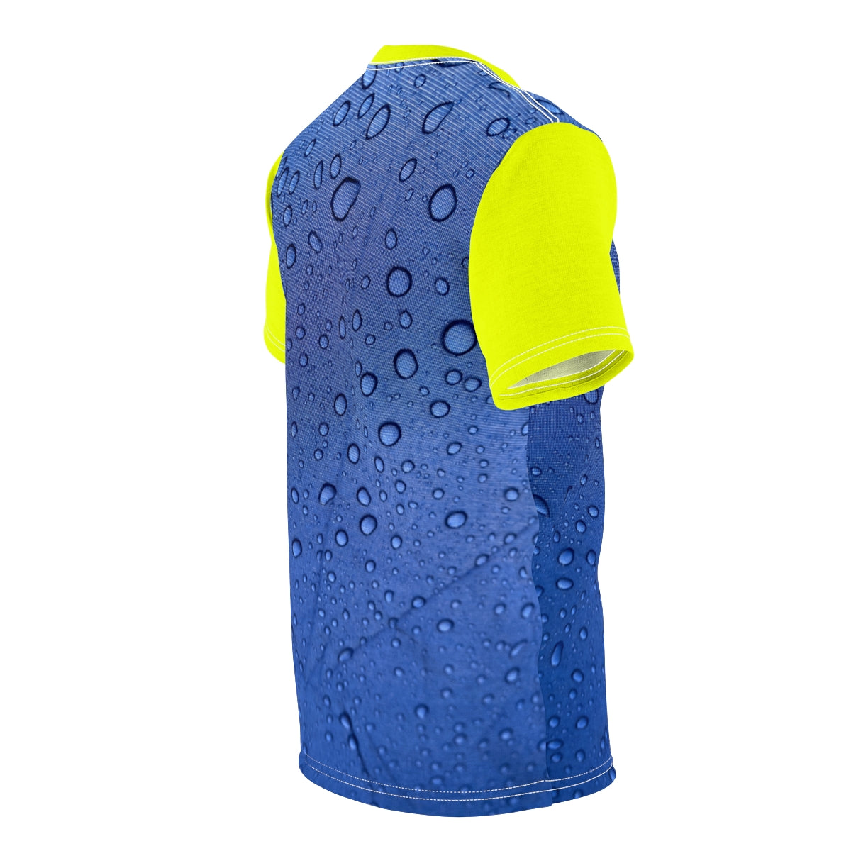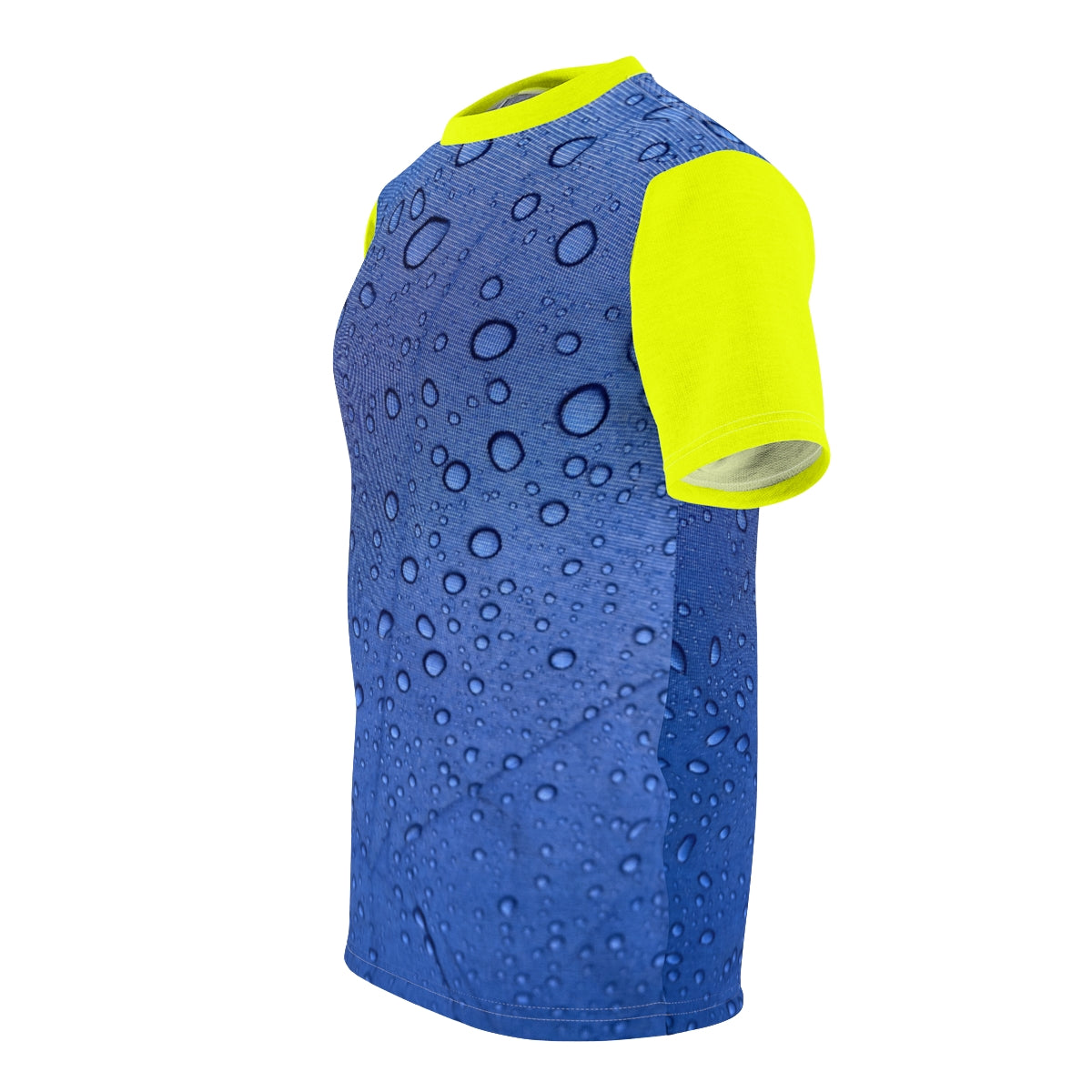 This Spring/Summer 2022 t-shirt features the image of raindrops on a bright blue synthetic umbrella photographed from beneath, contrasted with a bright fluorescent yellow collar and sleeves..