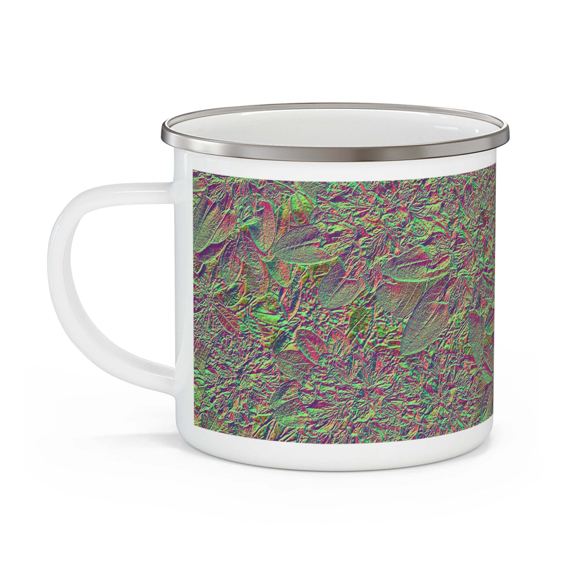 A cool durable enamel camping mug with an inverted photograph of foliage I took ca. May 2022.