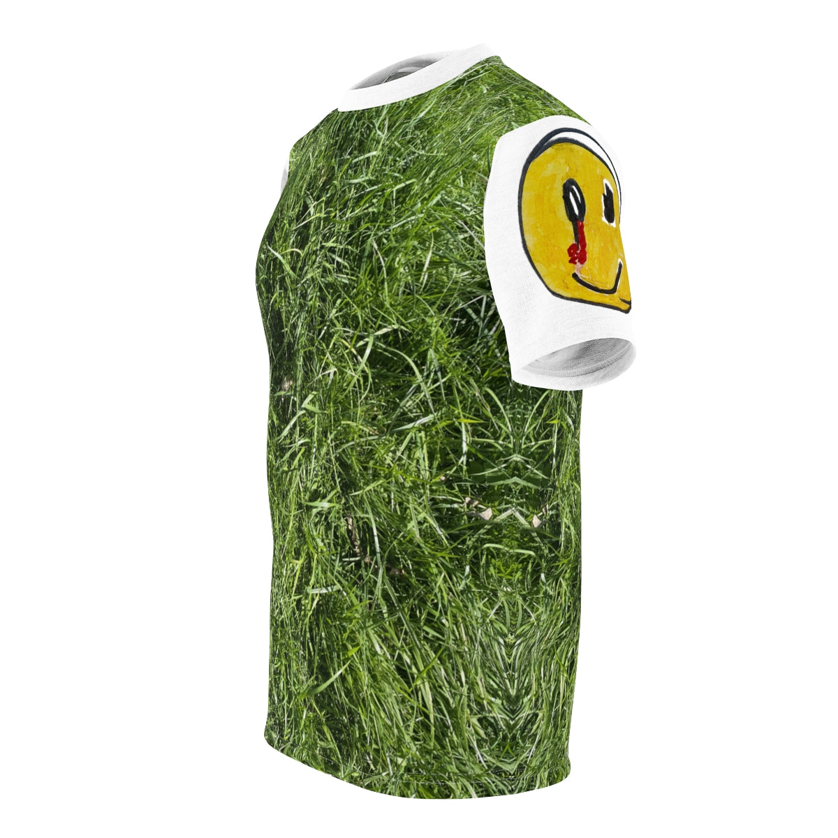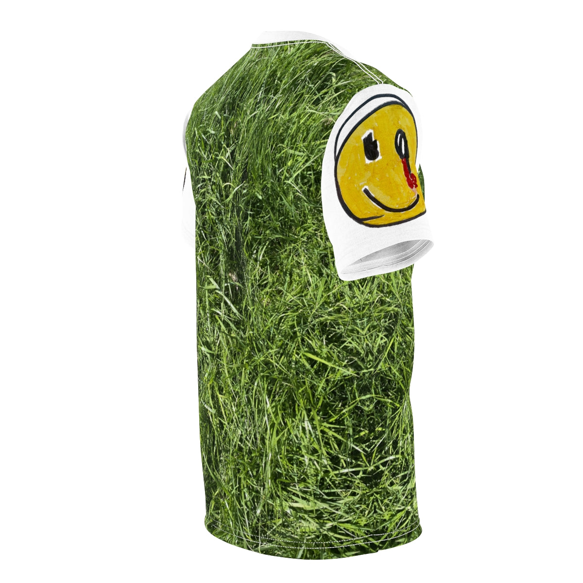 This t-shirt features a bright image of grass from April or May 2022 with counterpoint Keep Smilin' emblems on the sleeves. Eighty degrees one week, snowing the next, delays the onset of mowing season.
