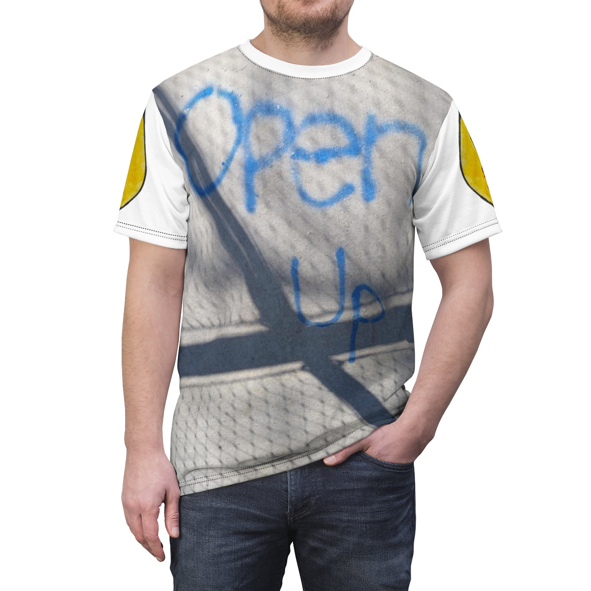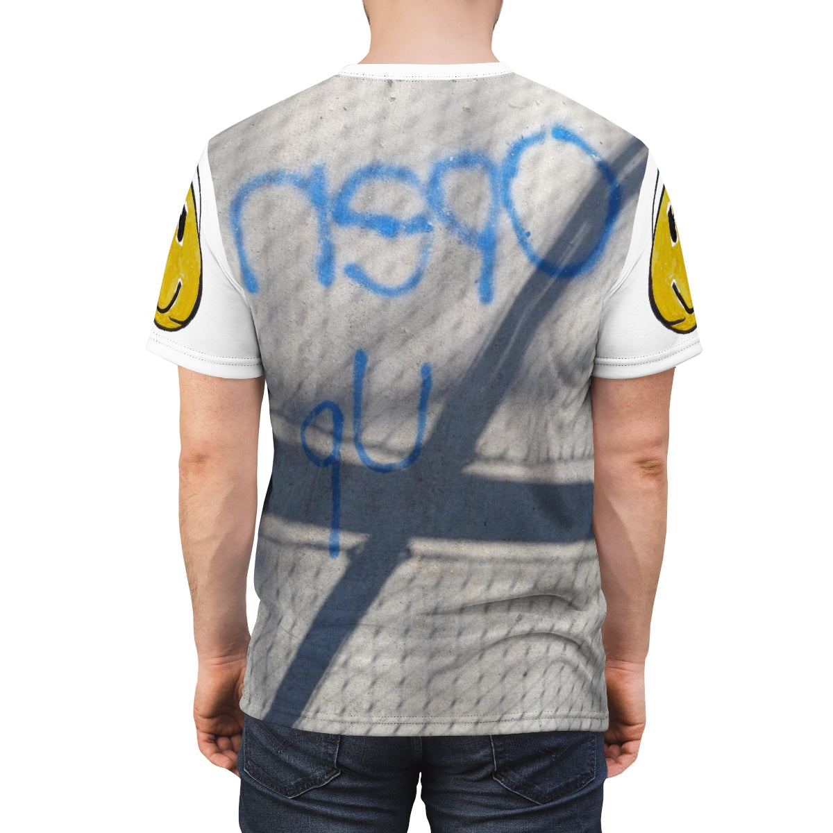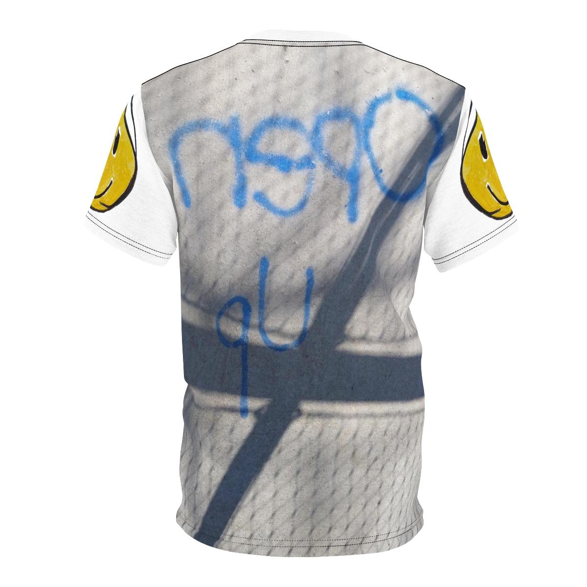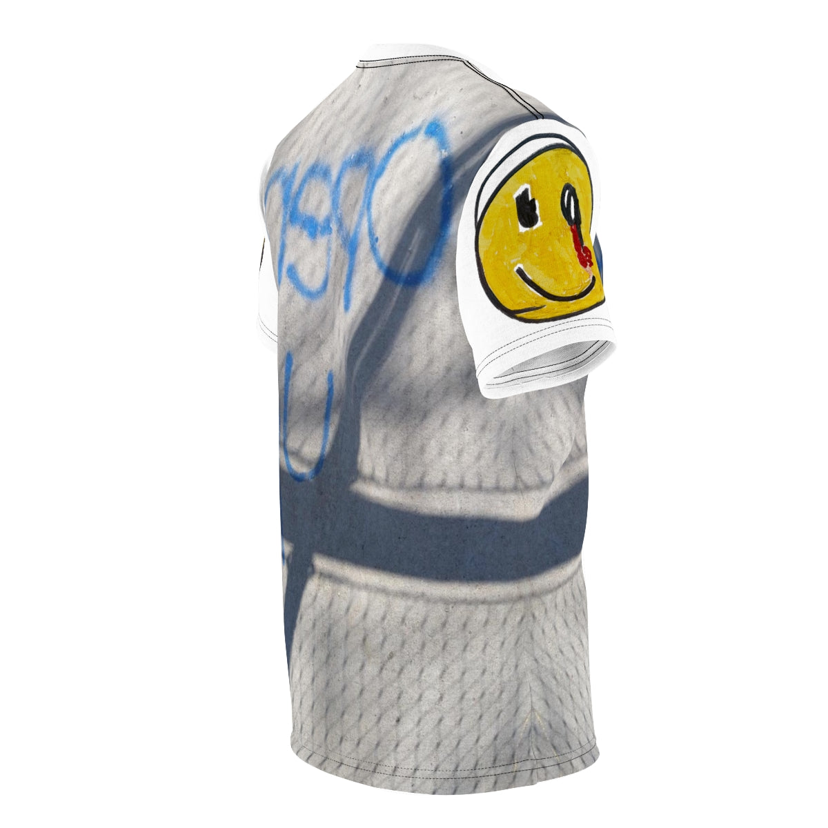 This t-shirt features the iconic "Keep Smilin'" logos on the sleeves and the image of a bit of graffiti on a very tall pedestrian bridge spanning a deep gorge through which Six Mile Creek runs. Know your rights. I didn't. Be well, stranger.