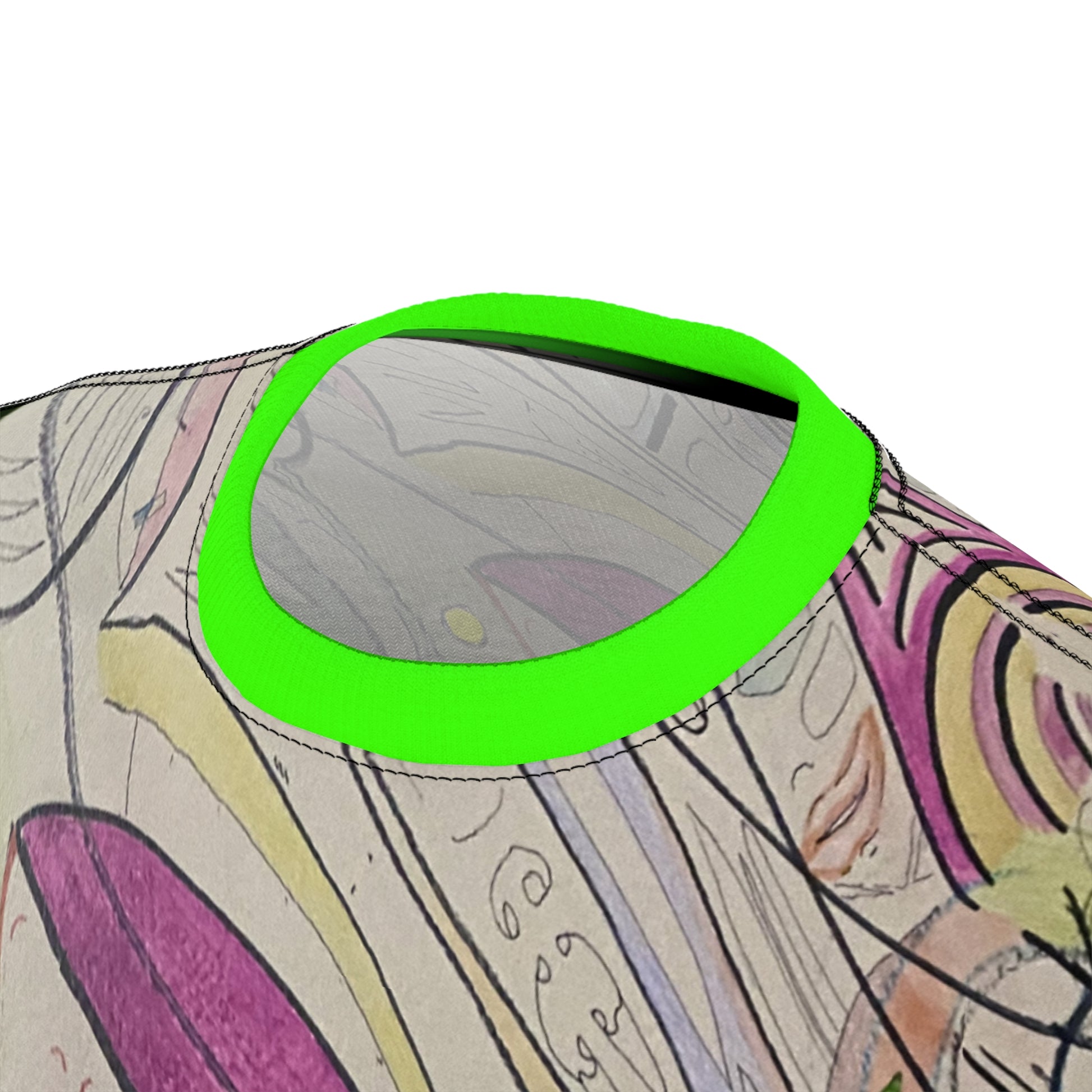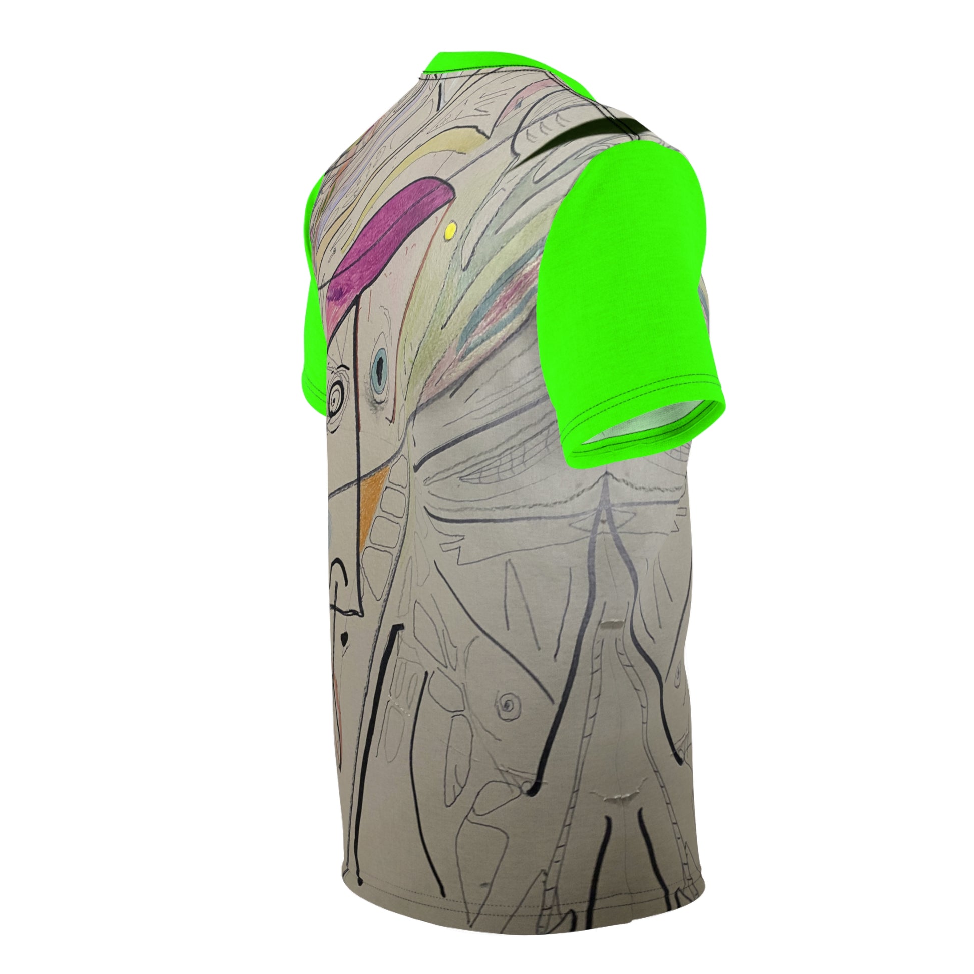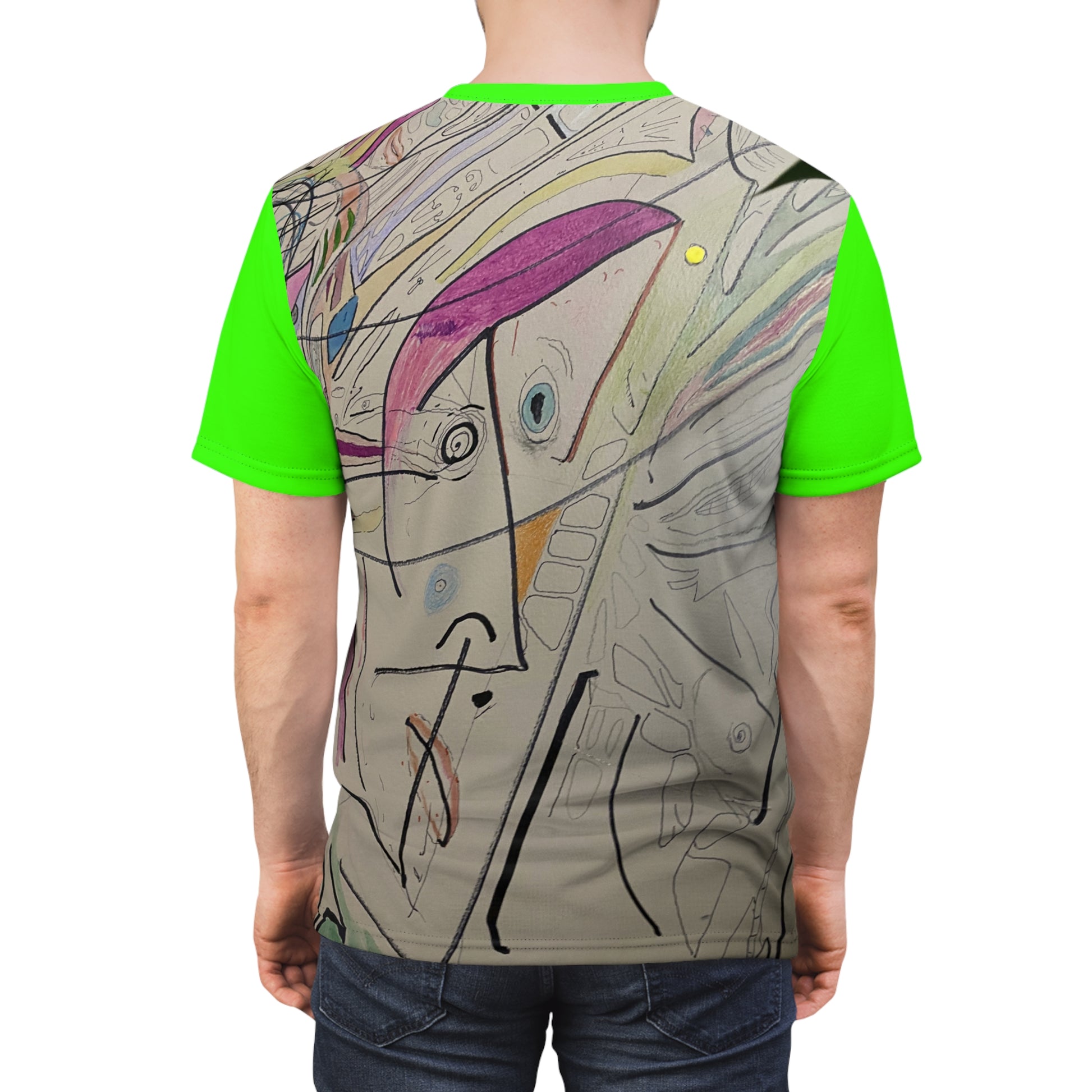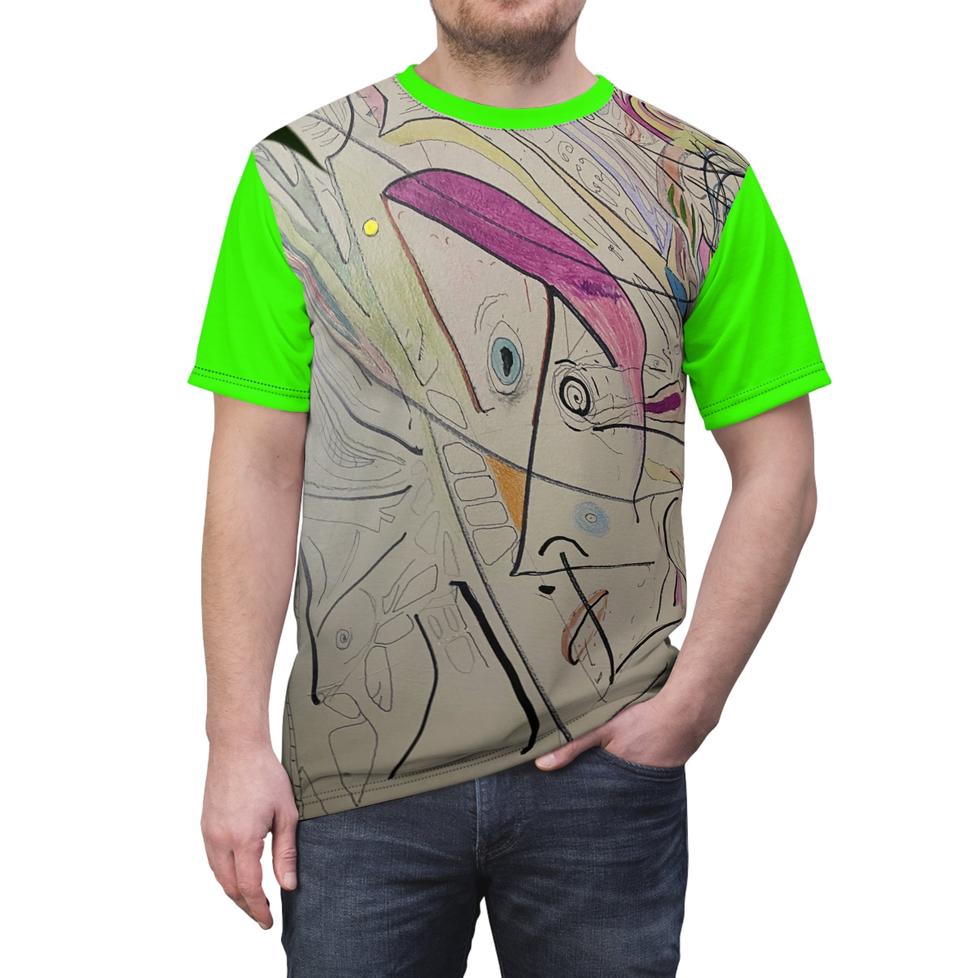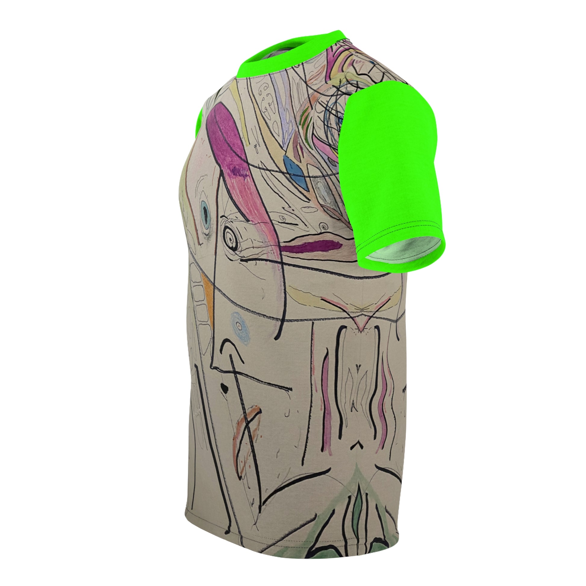 Bunnies & Ogives. This t-shirt features a work-in-progress, exploring contoured facial expressions moving along intersecting and nested circular and sinusoidal geometries. The pale soft inoffensive beige wall is countered by the bright glaring neon green lime, part of the cyberpunk aesthetic strain running through some of my designs. Light, airy, hip, fashionable, priced to move and to provide you with a great conversation starter, wherever you find your beach. Imagine meeting the love of your life wearing this between vibrant red Solo cups.