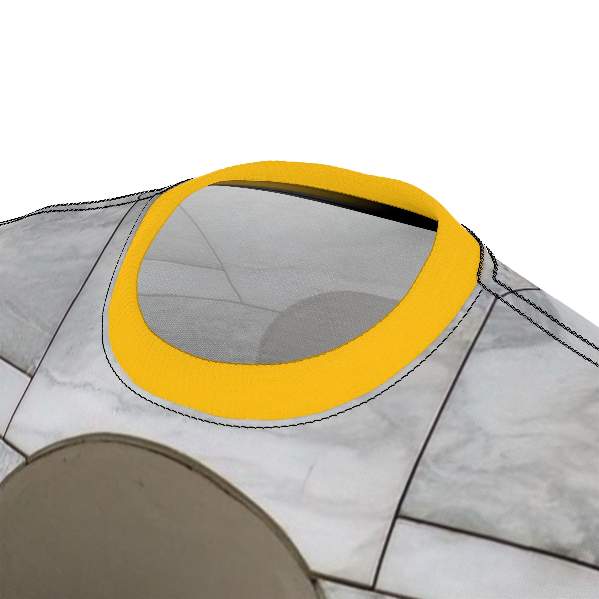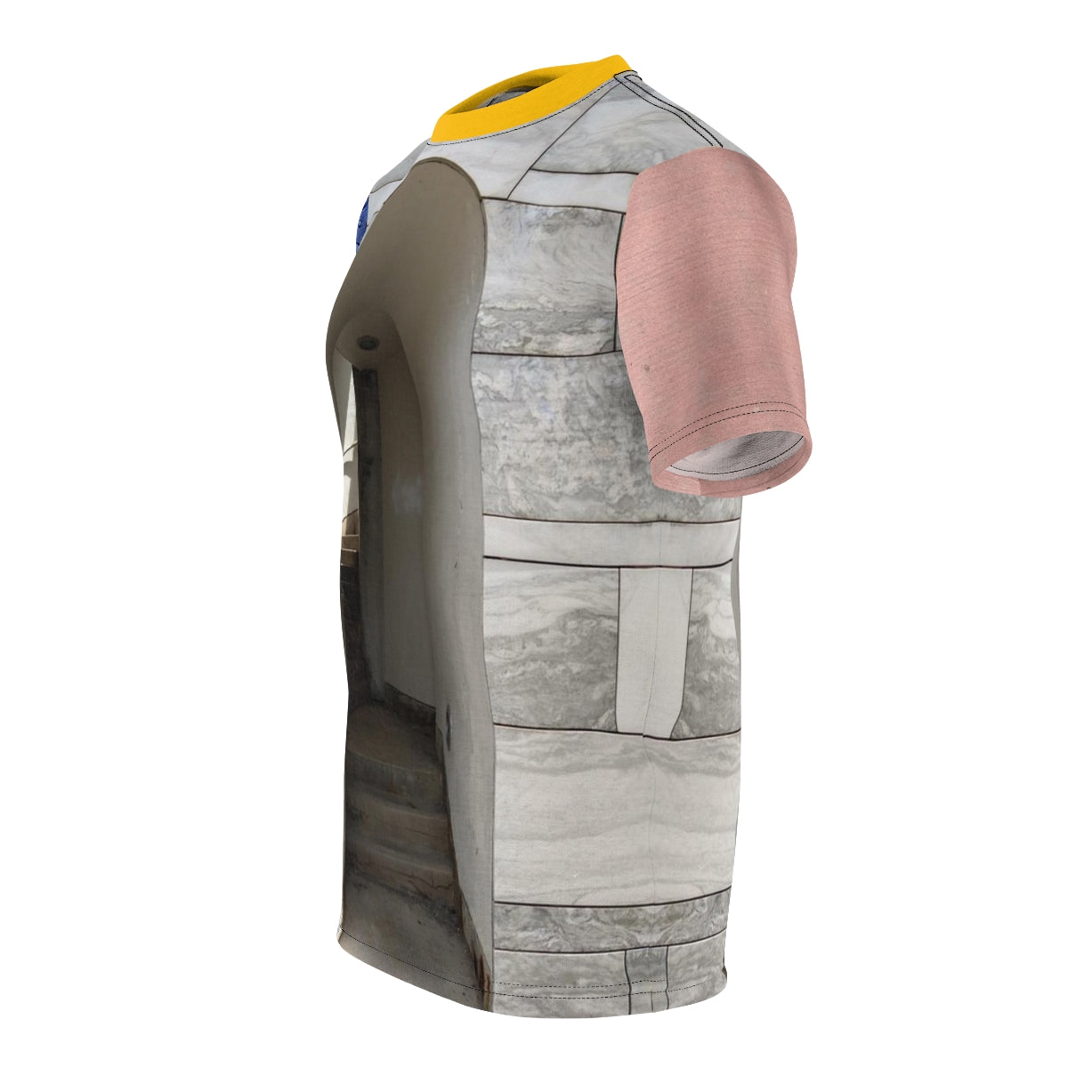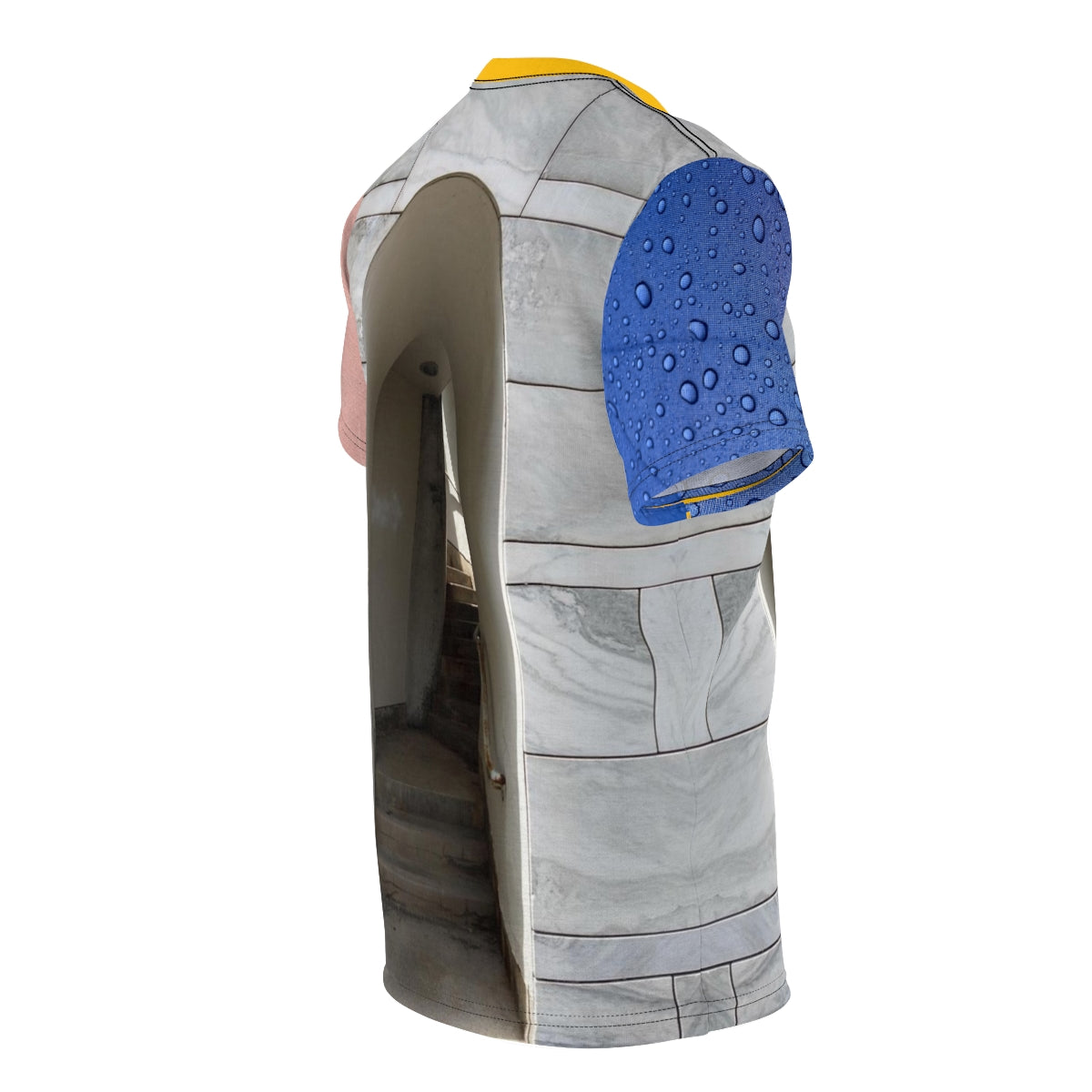 I have recently been interested in trompe-l'œil effects in art, architecture, and urban design. The t-shirt is a collage featuring recontextualized fragments of my urban photography -- blue rain drops on one sleeve, painted sidewalk on the other, complementary collar. The main photograph is of a staircase at The Schwartz Center for the Performing Arts designed by James Stirling & Michael Wilford. Their postmodern design language is extended by way of the t-shirt's title referencing a film quote. (-;